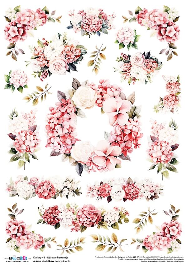 Arkusz dodatków do wycinania – Kwiaty 43 – Różowe hortensje
