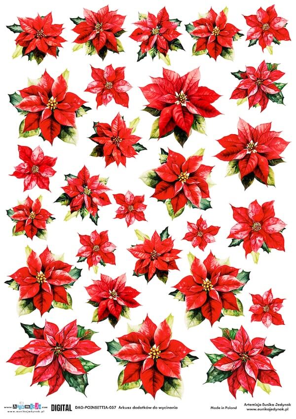 Poinsecje doskonale sprawdzą się jako główna dekoracja lub delikatne uzupełnienie kompozycji – w scrapbookingu, cardmakingu, art journalingu czy projektach DIY. To arkusz, który łatwo dopasujesz zarówno do minimalistycznych prac, jak i bogatszych, warstwowych aranżacji.