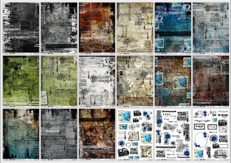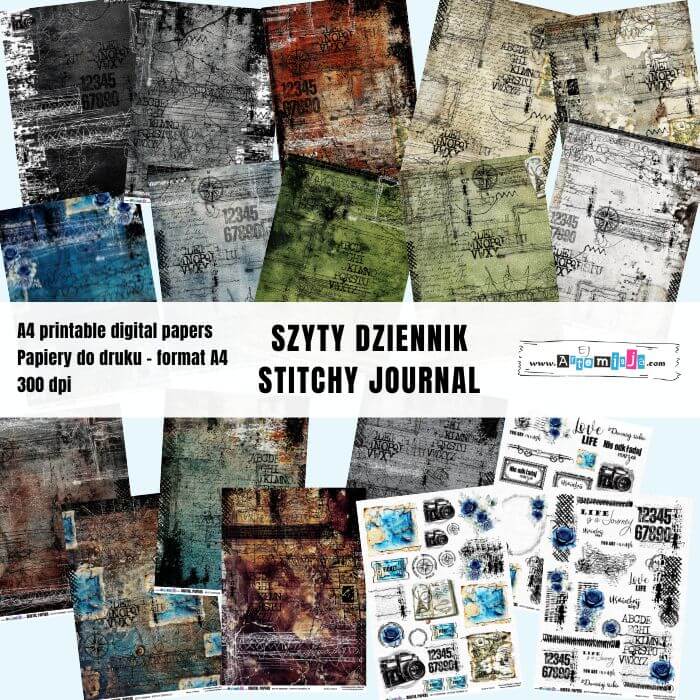 DUŻY ZESTAW PAPIERÓW DO DRUKU „SZYTY DZIENNIK – STITCHY JOURNAL” 18 arkuszy