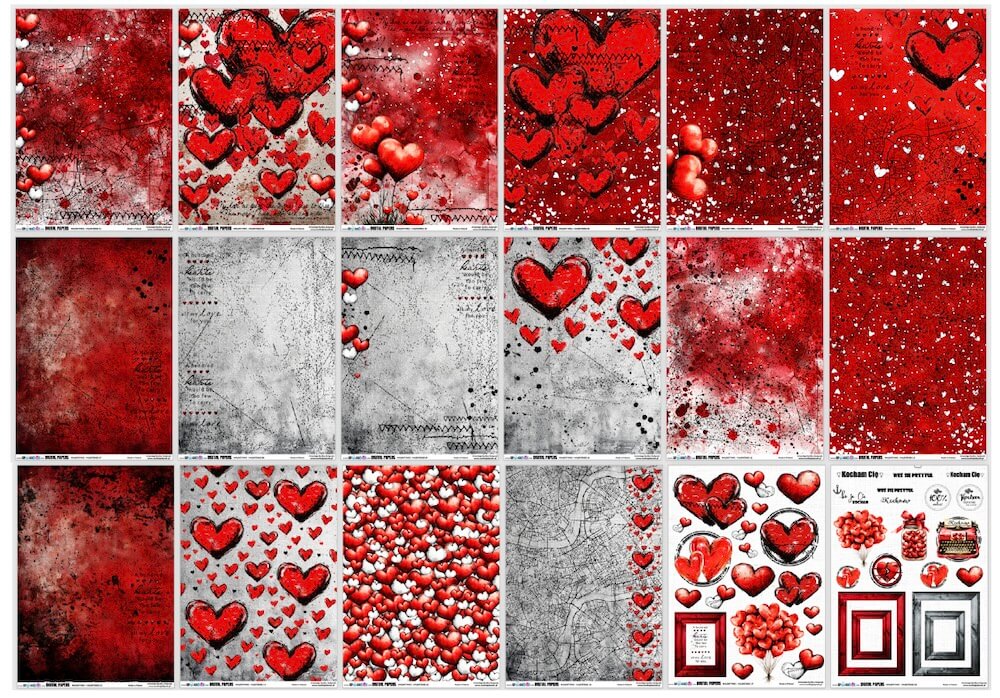 DUŻY ZESTAW PAPIERÓW DO DRUKU „WALENTYNKI – VALENTINES” 18 arkuszy