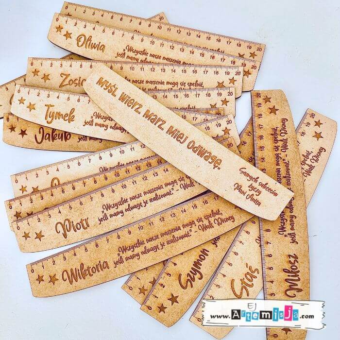Linijka z hdf, z grawerowanym imieniem i cytatem. Idealny prezent dla dziecka np. na Dzień Dziecka, jako upominek szkolny lub podziękowanie na zakończenie roku.