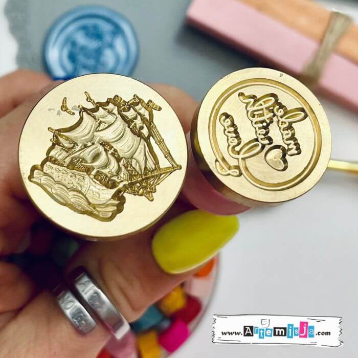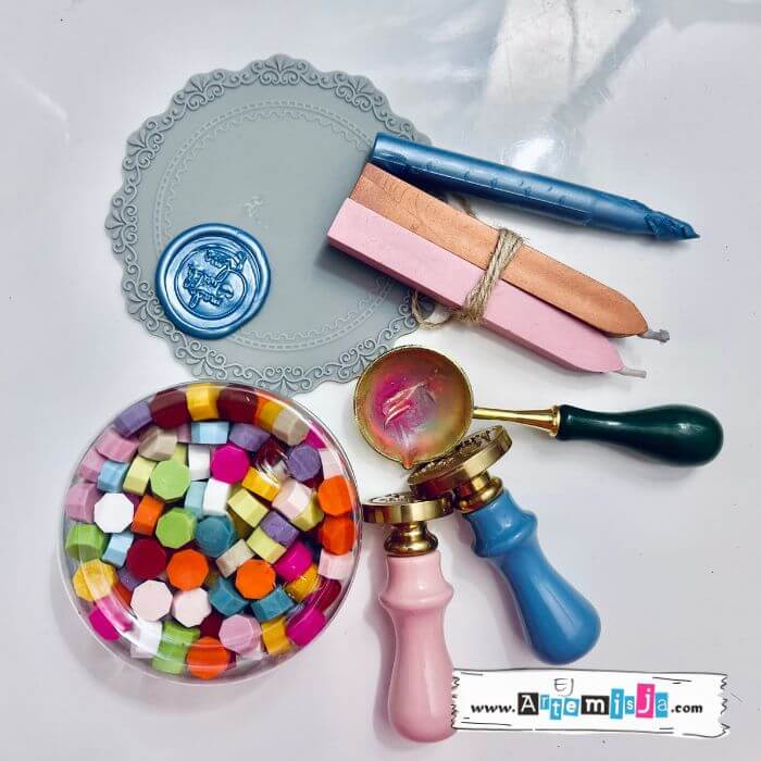 Przedmiotem sprzedaży jest zestaw widoczny na zdjęciu: silikonowa mata do lakowania, łyżka do topienia wosku, zestaw różnych wosków, 2x stempel z rączką – całość marki Malataranka.