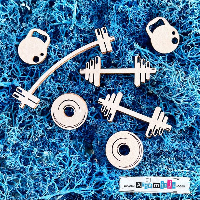 rozmiar: sztanga ok. 6,2 cm x ok. 1,5 cm, ciężarki ok. 4,0 cm x ok. 1,8 cm, ketle i talerze – ok. 2,0 cm