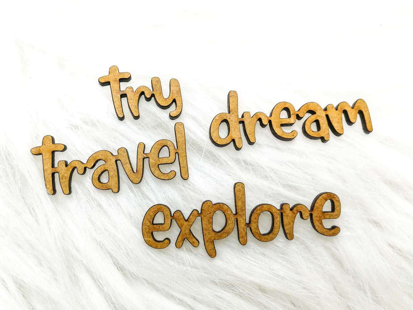 Zestaw napisów dekoracyjnych HDF – TRY, TRAVEL, EXPLORE, DREAM (małe S)